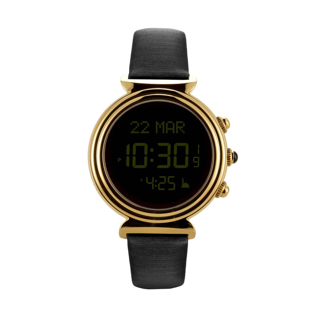 خصائص الساعة:مواقيت الصلاة في جميع مدن العالم.بوصلة الكترونية لتحديد اتجاه القبلة.منبه يومي بالاضافة الى منبهات لجميع الصلواتتقويم هجري و ميلاديلغة عربية أو انجليزيةمقاومة للماءقياسات الساعة:القطر: 37 ممالسماكة: 11 ممعرض السير: 20 مم
